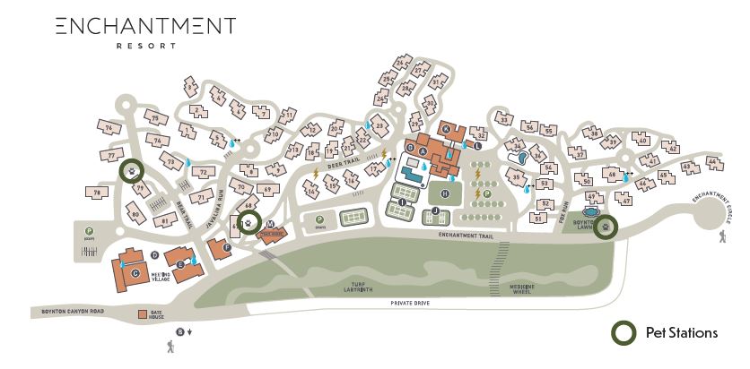 - You must clean up after your pet on resort property and surrounding hiking trails. The designated dog waste stations are equipped with “clean up bags” to use as necessary. Please see this map for Pet Station locations on property.